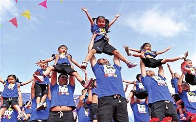 昨日,在宁夏银川一家幼儿园举行的迎“六一”演出中,家长与孩子一起同走上舞台,献上精彩的亲子互动演出。据新华社