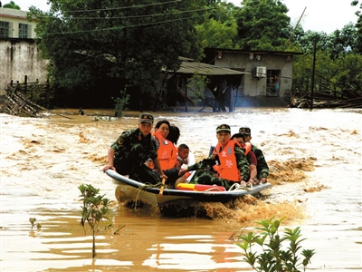 图为武警战士解救被洪水围困的群众。