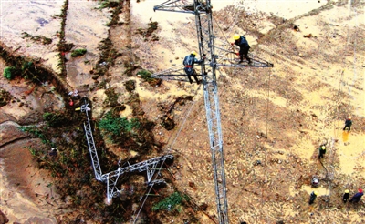 昨日,在崇阳县沙坪镇古城村110千伏通鹿线047号塔抢修现场,供电员工昼夜奋战,已完成竖塔放线,今日可恢复供电。据了解,全市供电系统出动抢修人员620人次,水毁线路。目前,停电线路已恢复90%。