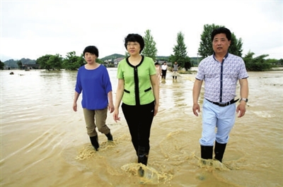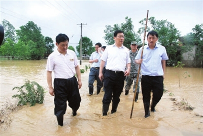 5点40分,在赶往沙坪镇的县人大主任王光新,行至石城镇黄龙村时,因道路被淹而受阻,就地指挥抢险救灾。
