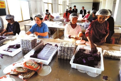(右图)5月底,湖北(通城)心甜心食品有限公司员工在加工薯类食品。该公司位于石南镇花亭村,产品远销北京、上海、沈阳等地,年产值达3500万元。记者 袁灿 通讯员 杨必正 摄