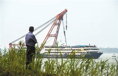 10日10时许,由一艘浮吊船、两艘拖轮与“东方之星”客船组成的编队缓缓前行。移泊编队前后方及两侧有多艘长江海事和长航公安的船艇引领、护航。