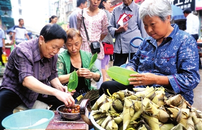 18日,温泉街头巷尾,市民纷纷为即将到来的端午节忙碌起来。 记者在菜场看到,粽叶、糯米、赤豆、蜜枣等包粽子的食材热销,艾叶、菖蒲也成了抢手货。记者 陈红菊摄
