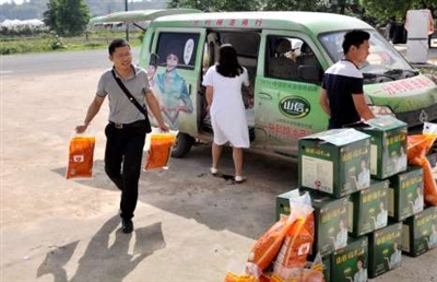 6月12日,赤壁祥瑞血浆站来到新店镇蒲首山村,为当地灾民送去了一百份大米和食用油,为受灾群众奉献一份爱心。 通讯员 张徐良摄