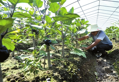 18日,通城县隽水镇上阔村城郊蔬菜示范基地,菜农何为海正在大棚里给茄苗整枝。