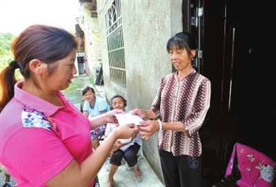 23日,咸安区高桥镇澄水洞村13组,村计生专干将在外务工的刘苗、甘婷夫妇的《生育证》送到其亲戚手中。为方便在外打工村民办理计划生育证件,该镇实行网上申请办证制度,截止目前,已代为办理《生育服务证》91本、《生育证》49本。
