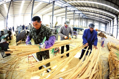 昨日,巨宁公司员工在利用重组竹生产高速铁路枕轨材料。