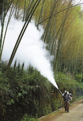 图②咸安区林业局工作人员在大幕乡南山村使用背负式喷雾器为竹林打药。通讯员 吴涛 吴翔 摄