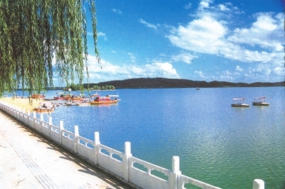 湖边微风吹拂,千米沙滩浴场上,三两成群,有带着小孩在湖边玩沙子的,有领着老人散步的。沿湖十里长堤,垂柳依依,片片花草绿影婆娑。临湖远望,湖面碧波荡漾,蓝天白云,水天一色。