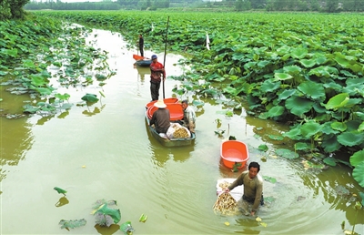 昨日,咸安区向阳湖镇甘棠村金源莲藕种植专业合作社,村民将刚采抽的藕带装袋运上岸。