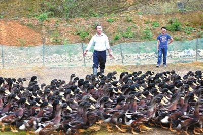 7月6日,新店镇益阳桥村,湖北安良农业开发有限公司养殖基地里,经营户台运良正在赶鸭子出去“遛弯”。目前,该养殖基地有江苏宿迁特种番鸭1500只,皖西白鹅50只,采用中草药饲养方式,因其肉质鲜美、口感好,在赤壁、武汉市场及各大酒店广受欢迎。 通讯员 张徐良摄