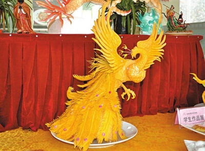 高达70厘米的华表蟠龙,意境悠远的空山月桂,振翅欲飞的金凤凰……在微信好友“HEJUN”的朋友圈里,一幅幅栩栩如生的艺术品,让人很难相信,它们是用南瓜、萝卜、荷兰豆等蔬菜雕刻而成的。