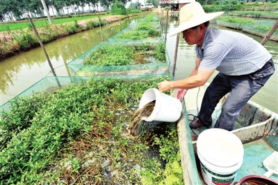7日,嘉鱼县陆溪镇官洲村1组,村民蒋国珍正将鳝鱼苗放进网箱。蒋国珍养鳝鱼已有10多年,目前网箱达到110多个。从6月底开始,他从外地购进1000多公斤鳝鱼苗开始陆续投放,预计10月份便可上市销售,每个网箱纯收入可达300元左右。