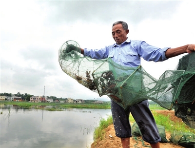 8日,通山县大路乡小龙虾养殖基地,虾农正拉网收小龙虾。该乡通过改造冷浸田,规划发展1万亩龙虾养殖基地。目前,一期5000亩、456户农户已开始养虾,剩余5000亩也已启动改造。据悉,每亩年净利润可达4000元,农户亩平纯增收1500元。