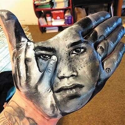 近日,美国加州著名艺术家拉塞尔在左手上绘制了一幅幅逼真的肖像画,并将其印在纸张画布上,并以此作为作品的永久印记。拉塞尔表示这项艺术手法颇有难度,他不仅要克服手掌不规则的表面进行细致的绘画,还要在颜料干燥之前将画作迅速完成以便能印出清晰的印记。
