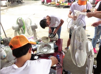 24日,湖北科技学院电信学院的9名学生来到温泉泉塘村,开展暑期社会实践活动,为村民免费维修家电。除了维修家电,学生们还向居民宣传了安全用电、节约用电知识。 通讯员 吴偲摄
