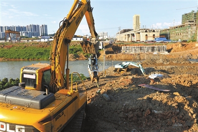 7月28日,龙潭大桥施工现场,湖北兴达路桥公司员工正在加班加点开挖龙潭大桥二号墩承台基坑。