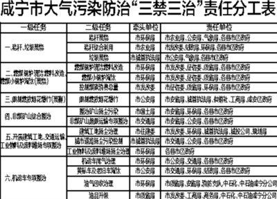 各县(市、区)人民政府、咸宁高新区管委会是辖区内大气污染防治的责任主体,要按照本方案的工作任务和要求,结合实际制定大气污染防治工作方案,细化、量化工作任务,并分解落实到相关责任单位。各有关部门要按照本方案的要求,各司其职,各负其责,严格制定和落实相关配套措施,加大工作力度,形成推动大气污染防治工作的合力。