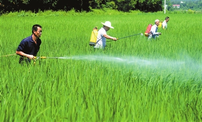 昨日,咸安区马桥镇农机人员在曾铺村稻田里喷药防虫。正值稻飞虱等水稻病虫害高发季节,我市各地农业部门积极组织农技人员,深入田间地头,帮助广大农民进行病虫害防治,确保全年粮食丰产丰收。
