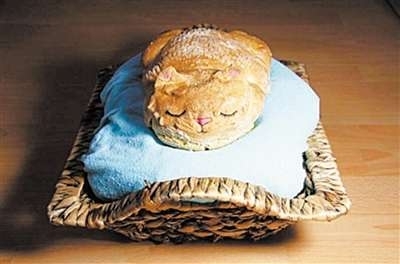 乍一看,图片上一只可爱的猫咪正趴在篮子里睡大觉呢。其实,这是由英国烘焙师和食品艺术家罗打造出的猫咪面包。