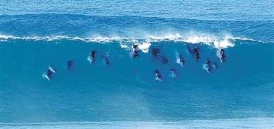 日前,一名72岁的摄影师在南非东北部海边拍到一群海豚欢快冲浪的画面。这名摄影师名叫查尔斯,照片拍摄于南非东北部海滨小镇巴利托的海边。照片显示十几只海豚排成一行在浪尖中出没,仿佛在冲浪玩耍。这一景象在湛蓝大海的映衬下,显得格外美不胜收。(本报综合)