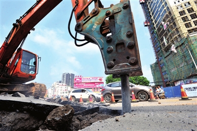 7日,温泉贺胜路岔路口段,大型破路机正对破损路面进行破除清表。