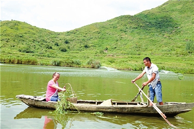 昨日,通城县塘湖镇荻田村四组养鱼专业户王民德夫妇在投草喂鱼。