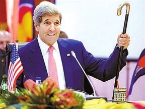 美国国务卿克里5月在阿尔卑斯山区骑自行车时发生摔伤事故,右腿股骨摔断,术后一直未能脱离拐杖。近日,他喜获肯尼迪家传拐杖,在8月初的吉隆坡东盟外长系列会上,克里不停地向各国外长展示这支“很有历史”的拐杖。