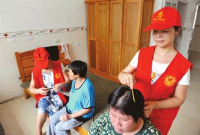 18日,通城县城区福利院内,县直机关单位党员志愿者们正为院民梳头、剪指甲。据悉,在当日的“通城义工·红色情怀”党员志愿者服务活动中,共有1500余名来自县直各单位的职工参与。