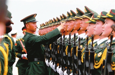 曾为一名模特的三军仪仗队队员门佳慧在进行训练(左图)。三军仪仗队在阅兵训练基地进行严格训练(右图)。