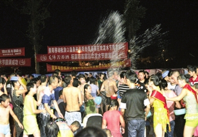 首届泼水节的活动内容丰富,有歌舞、免费喝啤酒、烧烤、泡温泉等,来自崇阳及邻县市区的上万人聚在近千平方米的场地上狂欢,场面极为热闹,男女老少像傣族同胞一样相互泼水祈福。