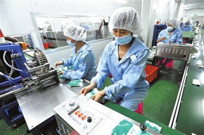 8月24日,嘉鱼稳健医用纺织品有限公司车间,工人们正在流水线上作业。