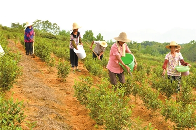 8月25日,崇阳青山镇城万村白茶基地,村民正在给茶叶施底肥。基地之前是山改地,村民通过施肥、除草,促进茶苗生长,提高茶叶产量和品质。 特约记者 王芳芳通讯员 刘旺云摄