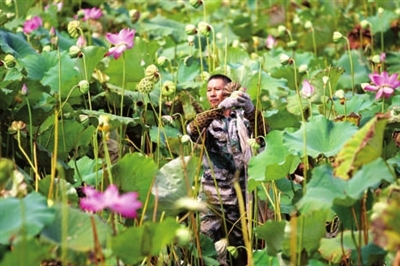7日,咸安区向阳湖奶牛良种场职工张咸宁在荷田里采摘莲蓬。