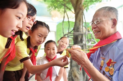 9月7日,在体育馆路小学的开学典礼上,90岁的老战士丁仲华为学生介绍自己的荣誉勋章。