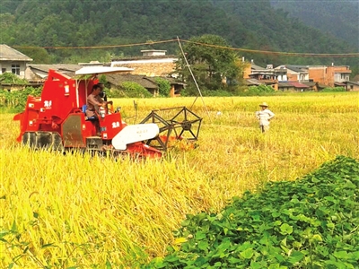 9月6日,洪港镇西坑村稻农驾驶收割机,抢抓晴好天气收割水稻。 今年,该镇不断加强水稻新品种和新技术的推广应用,确保稻谷颗粒归仓。通讯员 阮长安 钱成成摄