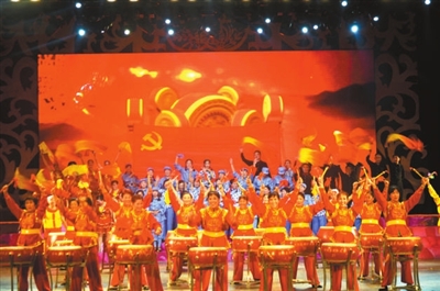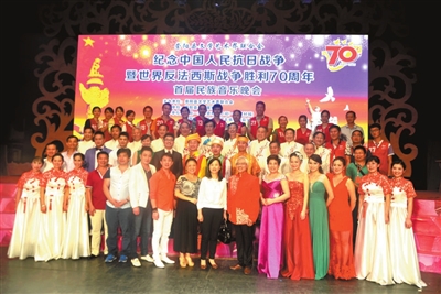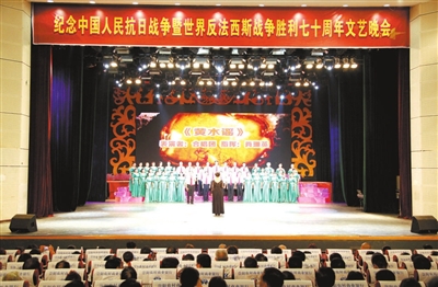 大合唱《黄水谣》、《四渡赤水》拉开了晚会序幕,演员们用真挚的情感,唱出了抗日战争时期人民流离失所、家破人亡的悲痛和对日寇野蛮侵略的愤怒。晚会节目形式多样,精彩纷呈,有舞蹈、独唱、斗笠舞、提琴戏、小品等艺术表现形式,饱含深情的配乐诗朗诵《中华民族笑傲苍穹》,向人们讲述了70年前艰苦卓绝的抗争史,提醒人们永远铭记历史,珍爱和平;歌舞《地道战》、《大刀进行曲》,唱出了中国人民的革命乐观主义精神,表达了中国人民对取得抗日战争胜利的坚定信心;斗笠舞《万泉河水清又清》、大型歌舞《抗日胜利之歌》中经典的旋律、熟悉的歌词、优美的舞蹈,更是把晚会推向了高潮,引起观众的强烈共鸣,赢的阵阵热烈掌声。