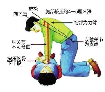 五、人工呼吸,每30次按压后2次人工呼吸,此为一组,5组为一个循环直到医护人员到达。人工呼吸时要检查口腔内有没有异物,然后开始。要口对口呼吸,2次吹气,每次1秒钟,吹气后继续按压心脏(如图3)。