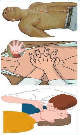 手法:以掌跟按压,两手手指扣在一起, 跷起离开胸壁手指基本与肋骨平行(如图2)。