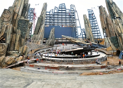 第七届国际温泉文化旅游节临近,为确保《嫦娥》实景神话剧在节会期间如期开演,施工人员正加班加点,保质保量推进工程建设。