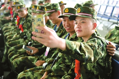 9月15日,在合肥南站,即将离开家乡的新兵正在自拍。