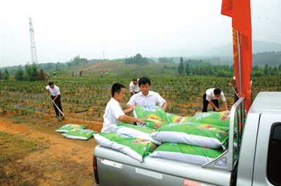 在石门村4组的灾后重建安置点,高处山坡上,鲜艳的“党员志愿先锋队”的队旗迎风飘扬,一群身穿白色衬衫、胸佩党徽的党员志愿先锋队队员正在帮忙劳动,铲土,装筐,传递,填充,一道道工序在他们的配合下完成。同样县领导廖建鸣、李力、刘秋霞、曾维艳也没有闲着,操起铁锹、锄头等工具,在马路旁边栽桂花树。