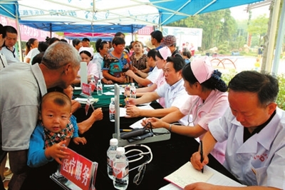 “免费发放药品,量血压,做健康咨询、检查;把你们家里过期、零散药品都可以换新;你的血压有些偏高,要注意饮食,配合吃点降压的药品。”