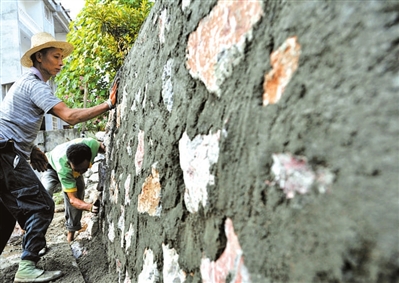14日,赤壁市赵李桥镇羊楼洞村松峰渠,工人们正在给渠道砌护坡。据了解,该市针对农村生活垃圾乱倒、生活污水乱排、农药化肥污染等现象,启动传统村落环境保护综合整治项目,根治农村脏乱差,建设美丽乡村。