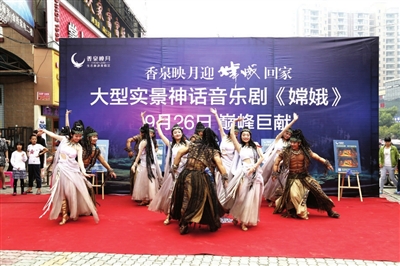 湖北香泉映月生态旅游发展有限公司投资打造的《嫦娥》作为第十届中国(武汉)国际园林博览会的主要节目之一,将于9月26日登陆湖北咸宁香泉映月生态旅游度假区。届时,《嫦娥》将通过音乐、舞蹈、歌曲、魔术、杂技等多种艺术元素的结合,在灯光、音响、舞台机械、数码影像等设施的配合下,与现场实体景观相融合,用演员丰富的表演,以音乐剧的形式将“后羿射日、嫦娥奔月”的故事娓娓道来,呈现出气势恢宏、奇幻瑰丽、如梦似幻的舞台效果。