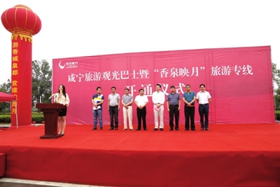 9月20日,咸宁旅游观光巴士暨“香泉映月”旅游专线开通仪式,在咸宁北站前广场举行。市委常委、宣传部部长王济民主持开通仪式,咸宁市人民政府副市长镇方松宣布咸宁旅游观光巴士暨“香泉映月”旅游专线开通,咸宁市委、市政府领导,市建委、市交通局、市公安局、市财政局、市城管局、市园林局、市物价局、市城投公司、市旅游委、各县(市、区)旅游局、香泉映月等相关单位领导出席启动仪式。此后,大型实景神话音乐剧《嫦娥》彩妆巡游表演精彩亮相。