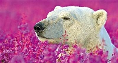 加拿大哈得逊湾的一只北极熊似乎看多了迪士尼影片《森林王子》,像片中的大熊巴鲁一样忘记了一切烦恼似的,在花田里静享花香。