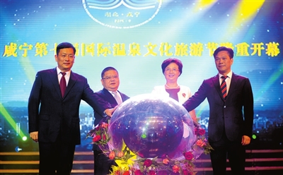 省人大常委会副主任王玲、副省长甘荣坤、市委代理书记李建明、市委副书记、市长丁小强共同启动按钮,宣布湖北·咸宁第七届国际温泉文化旅游节正式开幕。