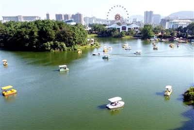 图①2日,天气晴好,十六潭公园热闹非常。市民携亲带友,泛舟湖面,沉醉在青山秀水之间。