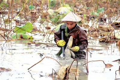 10月4日,渡普镇黄沙湾一片忙碌的景象:农民们在齐腰深的水里,俯着身弯着腰,拔荷叶、挖莲藕。